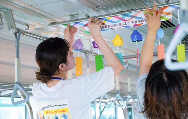 車内は「風」を感じるカラフルな紙風鈴で彩られ、取り付けには明星大学の学生も参加しました。