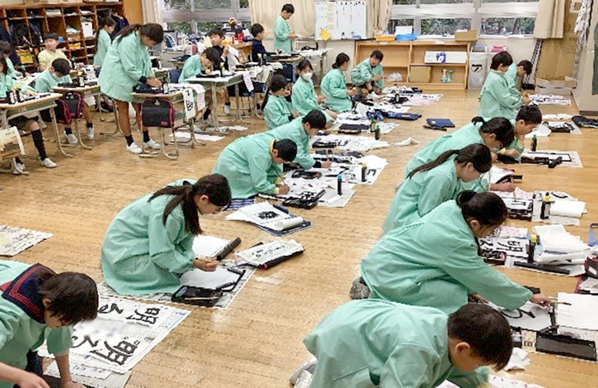 3年生は初めての毛筆で「正月」、4年生は「明るい心」が課題です。5、6年生は体育館で行いました。5年生の課題は「新しい風」、6年生は「将来の夢」です。
