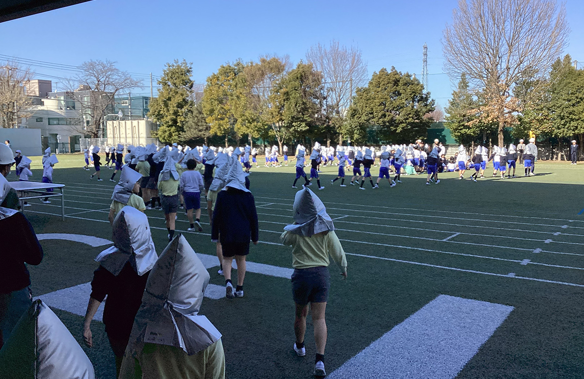 今回は放送機器が使えなくなったという想定で行い、先生方の声による指示に真剣に耳を傾けて、校庭に避難しました。