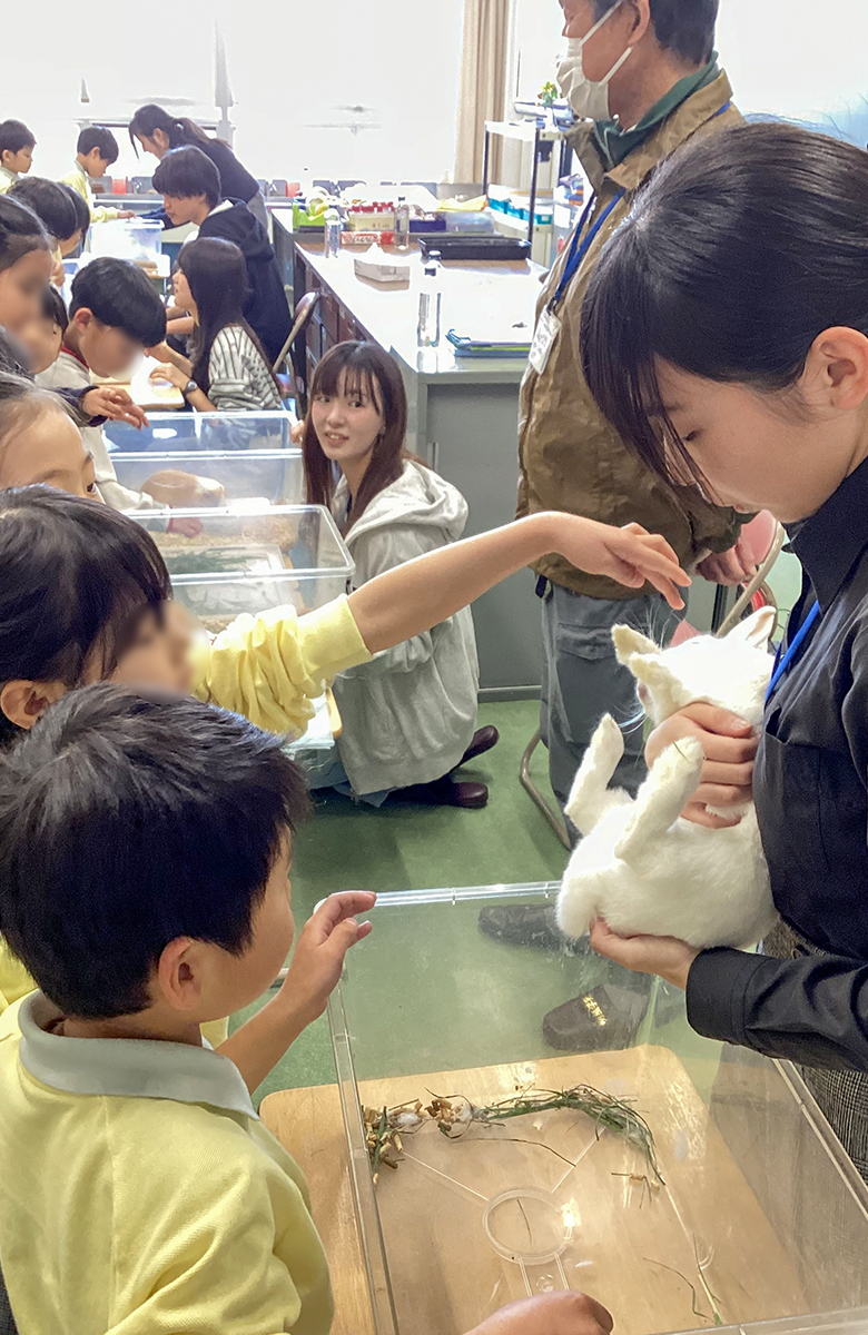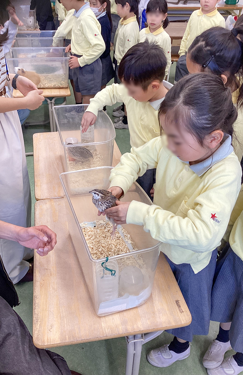 今回連れてきていただいた動物はウサギ・モルモット・ウズラ・マウスでした。抱き方やえさのあげ方を教えていただいた後、早速ふれあい体験が始まりました。「かわいい」「私も飼いたい!」などの感想が多く聞かれました。