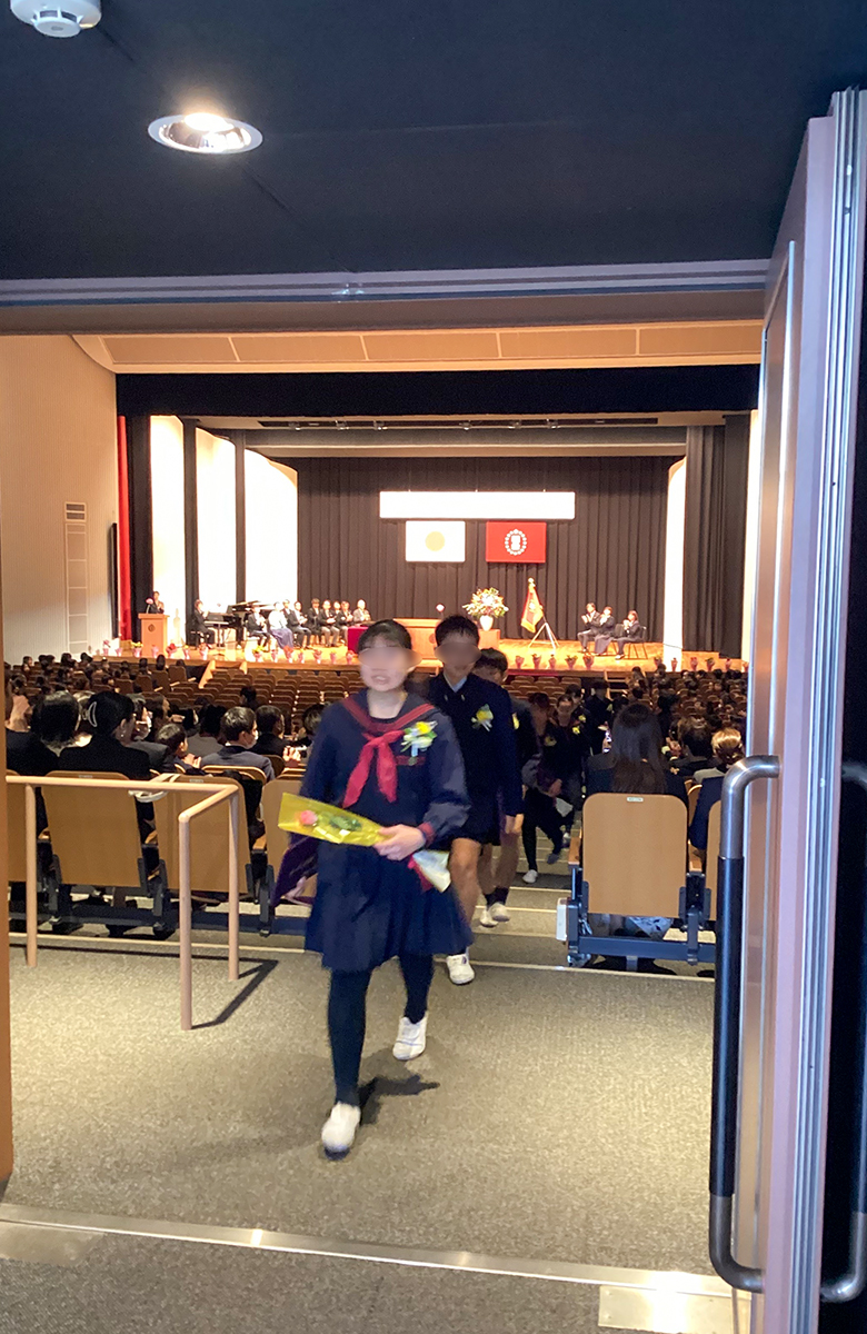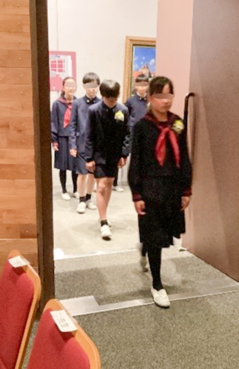 在校生代表による送辞、卒業生全員による感謝の言葉の後、卒業生からの歌「仰げば尊し」が贈られました。