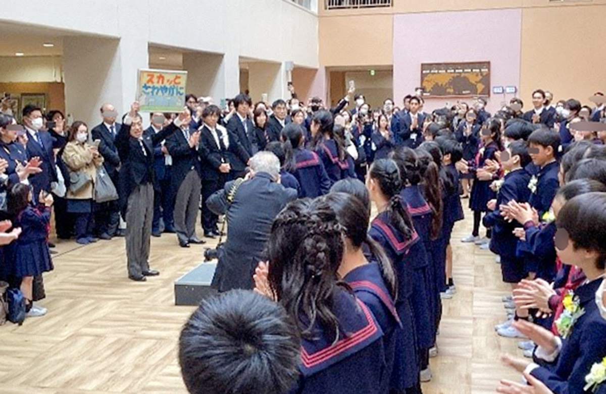 卒業生からは、歌のプレゼントと、恒例の「スカッと さわやかに」のポスターが校長先生に手渡されました。