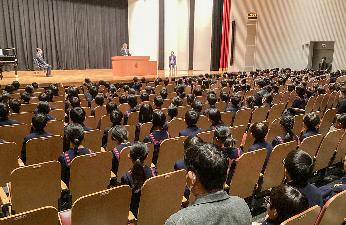 校庭の枝垂れ桜が咲く中、3月21日(土)に、児玉九十記念講堂で2025 年度修了式が行われました。