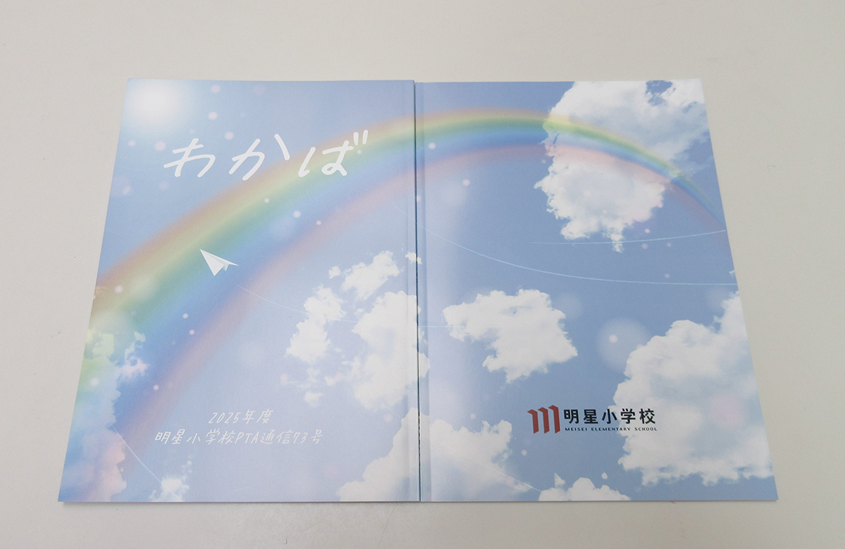 先生方とご家族のご協力によりPTA通信『わかば』73号が出来上がりました。 表紙の紙飛行機が青空に舞い上がる光景に、子どもたちがのびやかに成長して欲しいという願いを込めました。 今年も先生方や保護者の思いが満載の素敵な一冊になりました。