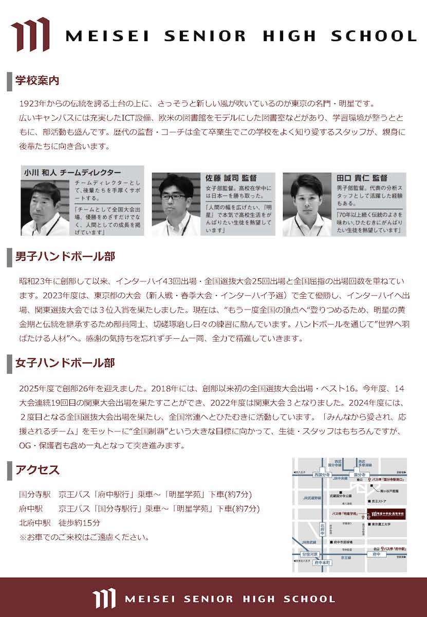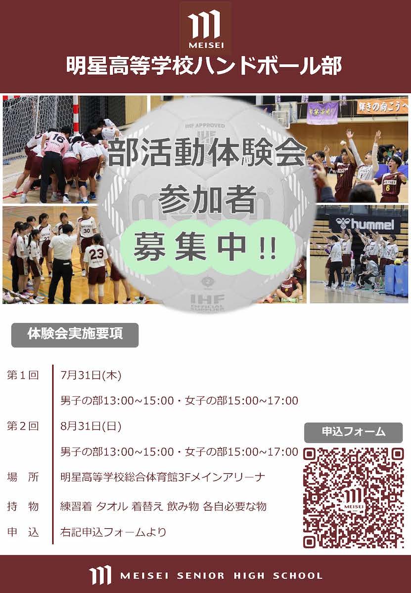 明星高等学校では、今年も体験会を実施いたします。 高い目標に向かって、仲間と共に全力で努力し成長を続けています。 本気でハンドボールに打ち込みたい皆さんを心から歓迎しています。 ※お申し込みは、資料内のQRコードからフォーム回答して下さい。 よろしくお願いいたします。 体験会資料のPDFはこちら 一覧に戻る