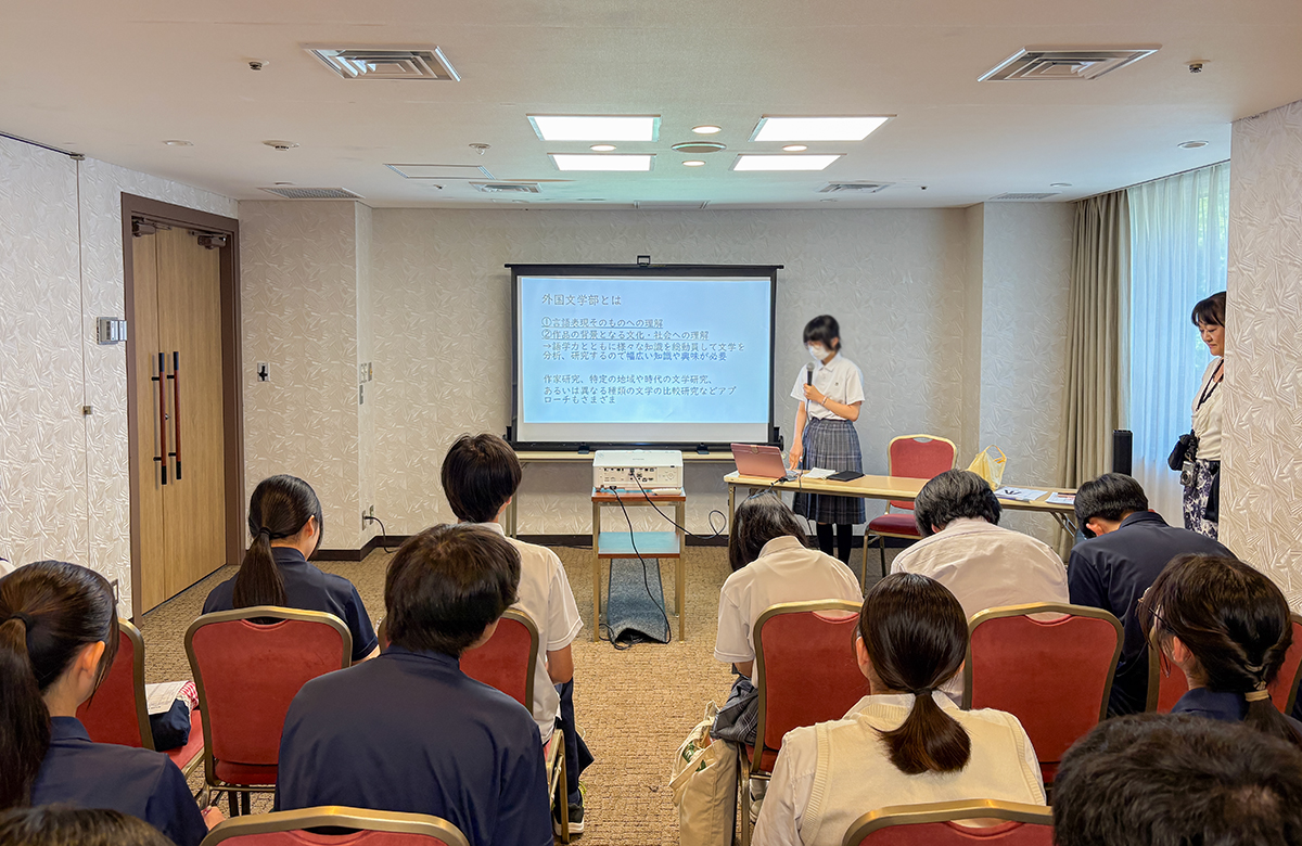 第一に、ひとりひとりが「学部学科探究発表」を行いました。学問分野の細分化が著しい昨今、多種多様な学部学科について、それぞれが違う分野を担当し、発表することで、アカデミックな選択における様々なヒントを得ることができました。