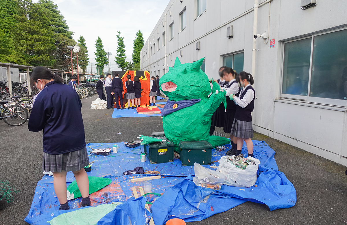 放課後には、グラウンドを使った応援団の確認や駐輪場横では体育祭マスコットの制作が進められていました。