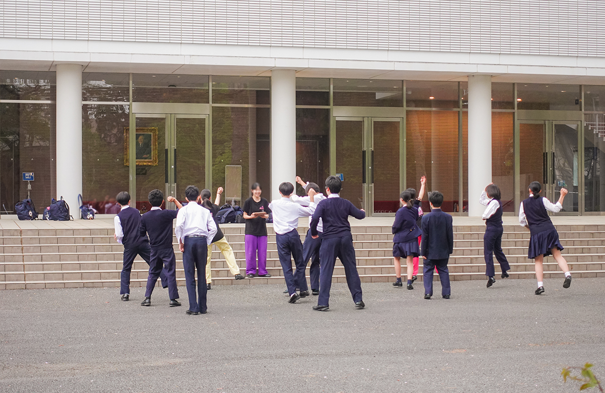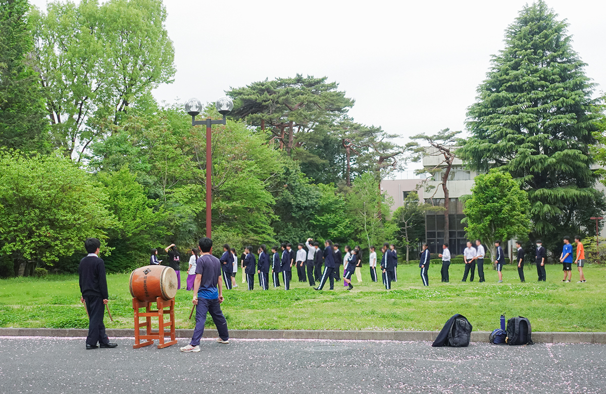 校内では、放課後になると、児玉九十記念講堂の前や中庭、いこいの広場などから元気な応援練習の声が聞こえてきます。どのチームも、趣向を凝らした応援を披露しようと、一生懸命に声を出したり、動きを合わせたりしている姿がありました。