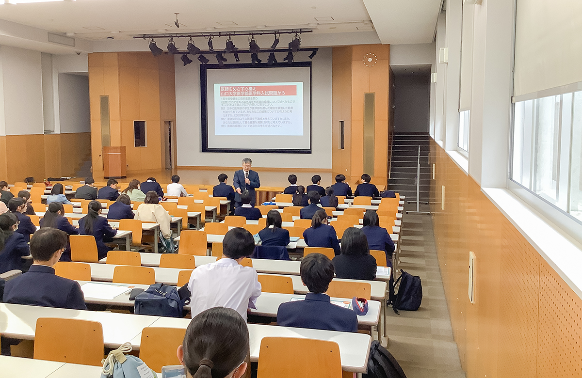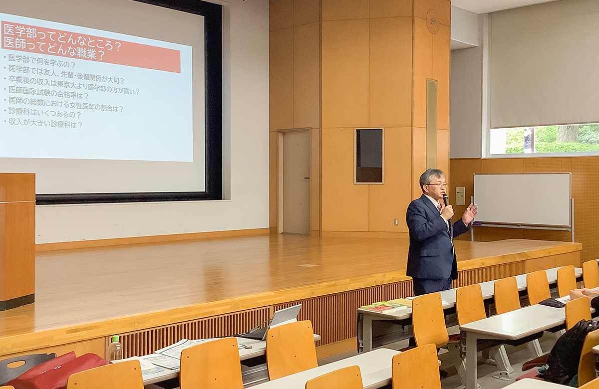 去る4月26日(土)、校内視聴覚ホールにて『医療系進路講演会』が開催されました。講師は今年度より本校特別顧問に就任された森弘達先生(札幌日本大学中学・高等学校副校長)に務めていただきました。講演内容は医療人材の育成についてでしたが、過去の大学入試問題を通して医療従事者の心構えを問いかけたり、現在医師として活躍している森先生のかつての教え子とのエピソードを交えたりする中、医療系学部を志望している生徒への熱い想いが溢れる講演でした。当日は医療系大学進学希望の生徒だけでなく、多くの保護者の方々を含め100名近くのご参加をいただきました。今後、本校において森先生は、「MEISEI医学・医療講座MLP」(全8回)を担当します。