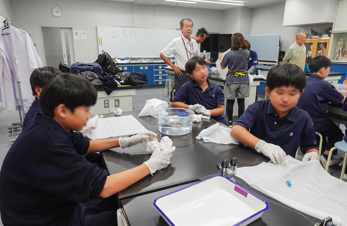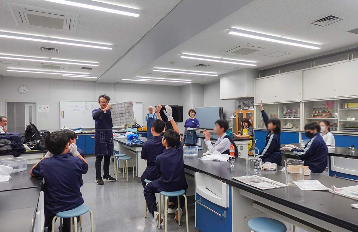 浸し始めのハンカチは黄緑色でしたが、だんだんと青い色に変化していきました。これは空気に触れて変化する酸化という化学反応です。生徒たちは、この「色が変わる仕組み」が自然界の化学反応(酸化)だと知ることで、化学を「勉強」としてだけでなく、身の回りに深く関わるものとして実感することができました。