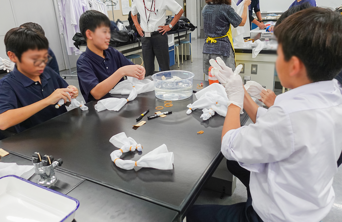 生徒たちは、どのような模様のハンカチを作るか真剣に考えながら、輪ゴムやビー玉、ローソクなどを使い、模様付けの準備を進めました。