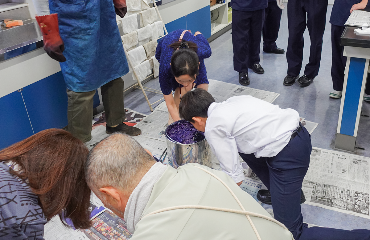 模様の準備ができたら、ハンカチをよく水につけ、よく絞ってから藍の染料に浸していきます。こうすることで、藍がよく浸透していということでした。