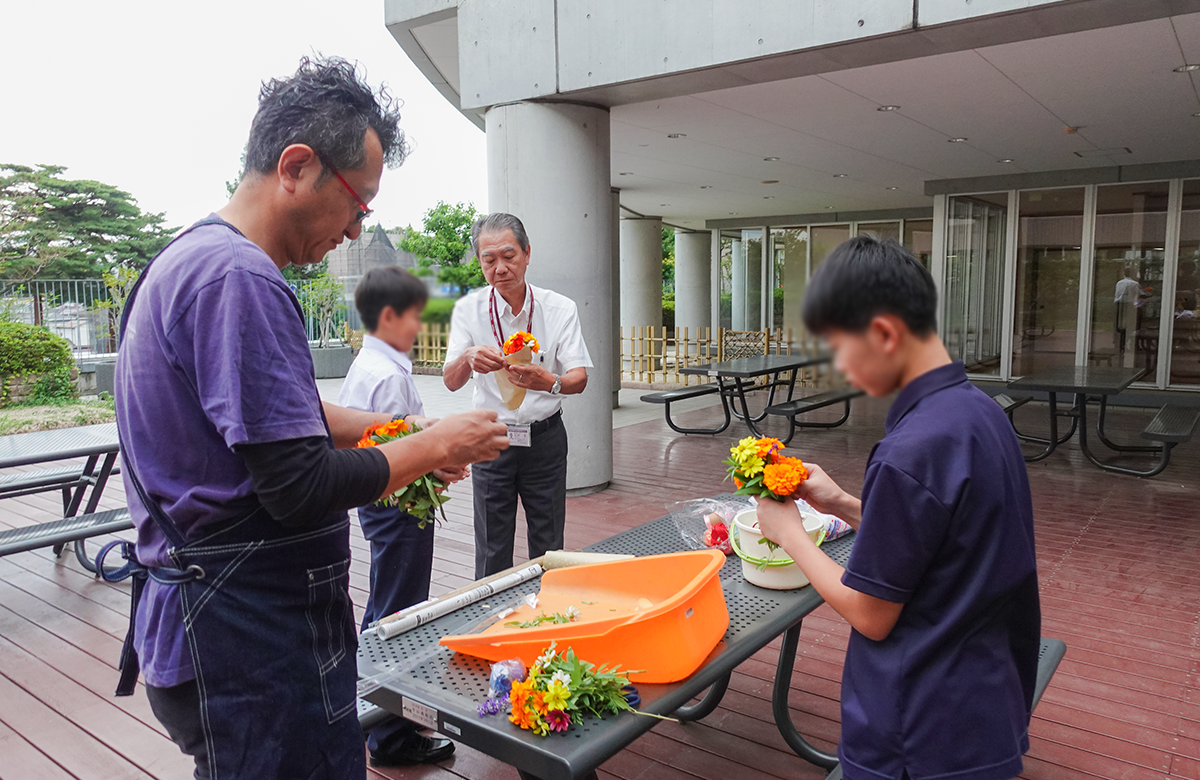 生徒たちは、その鮮やかな花の中から、自分の「好き」な色や形を選び、どのように組み合わせたら素敵になるかを真剣に考えながら、ブーケ作りに夢中になっていました。