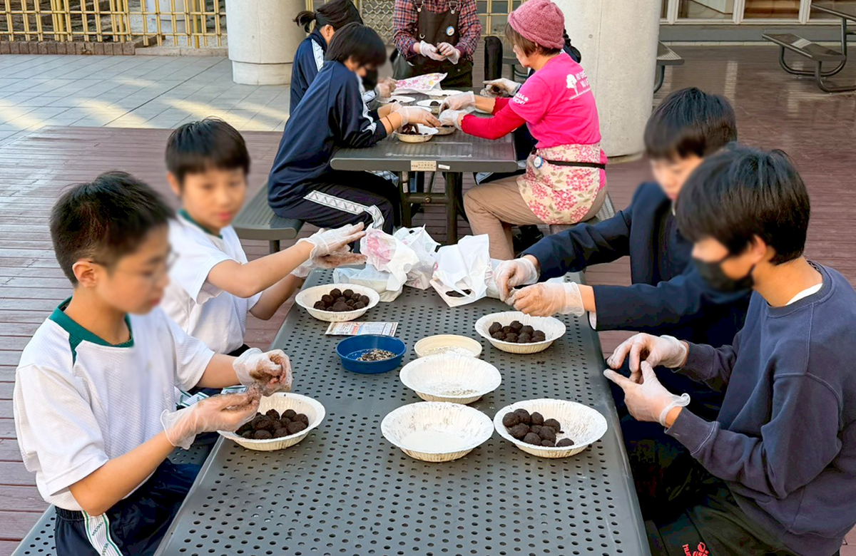 続いて、東側のベンチとテーブルのあるテラスへ移動し、たねダンゴづくりに挑戦しました。
