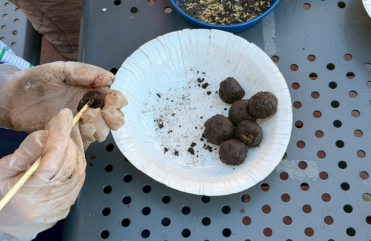 丸め直したダンゴの中に、肥料や発芽を促進するケイ酸塩白土を入れ、タネをまぶし、ふたたびケイ酸塩白土の粉をまぶしたら完成です。