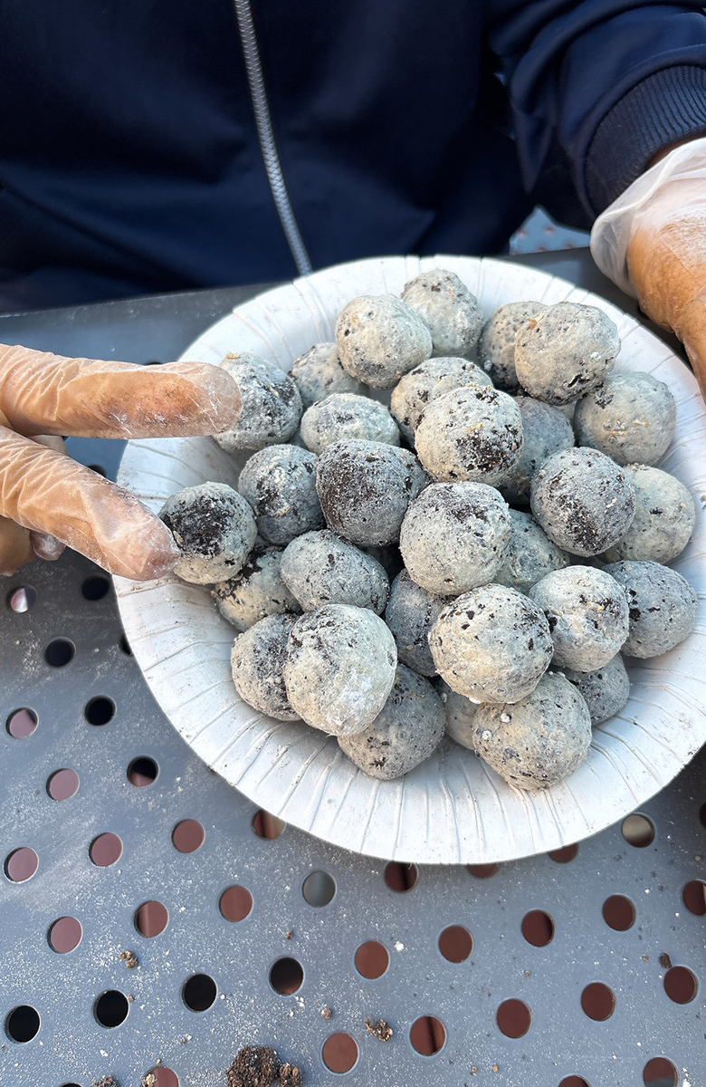 トリュフチョコのようなたねダンゴをもって、先生の指導のもと、ばらばらっと花壇に投げて、落ちた場所に埋めていきます。
