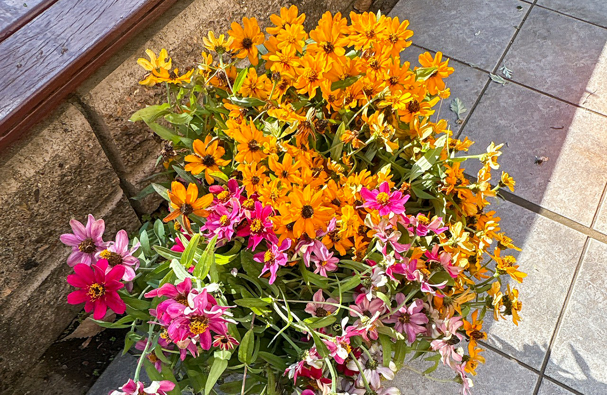 水をはったバケツに入れたジニアやマリーゴールドを使って、ブーケをつくって持って帰っていいですよ、といわれ、「えっ、ブーケつくりたい!」と目を輝かせる子たちの姿が印象的。