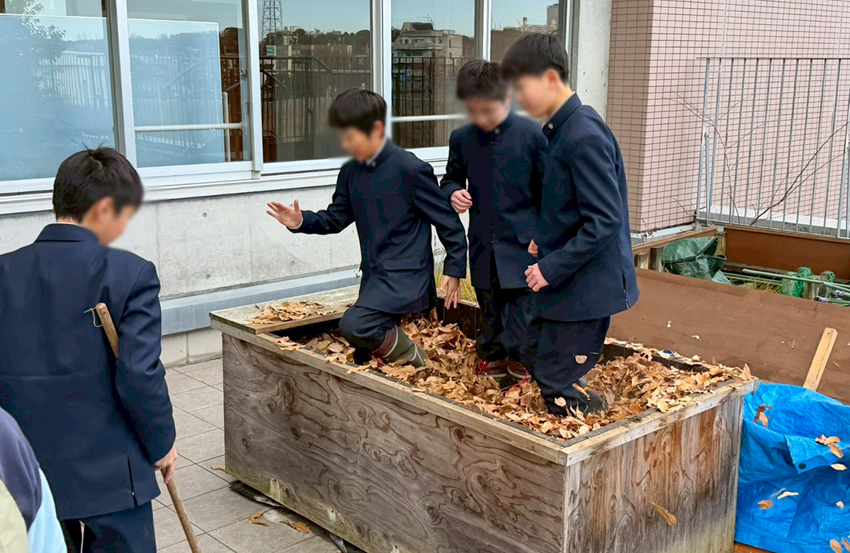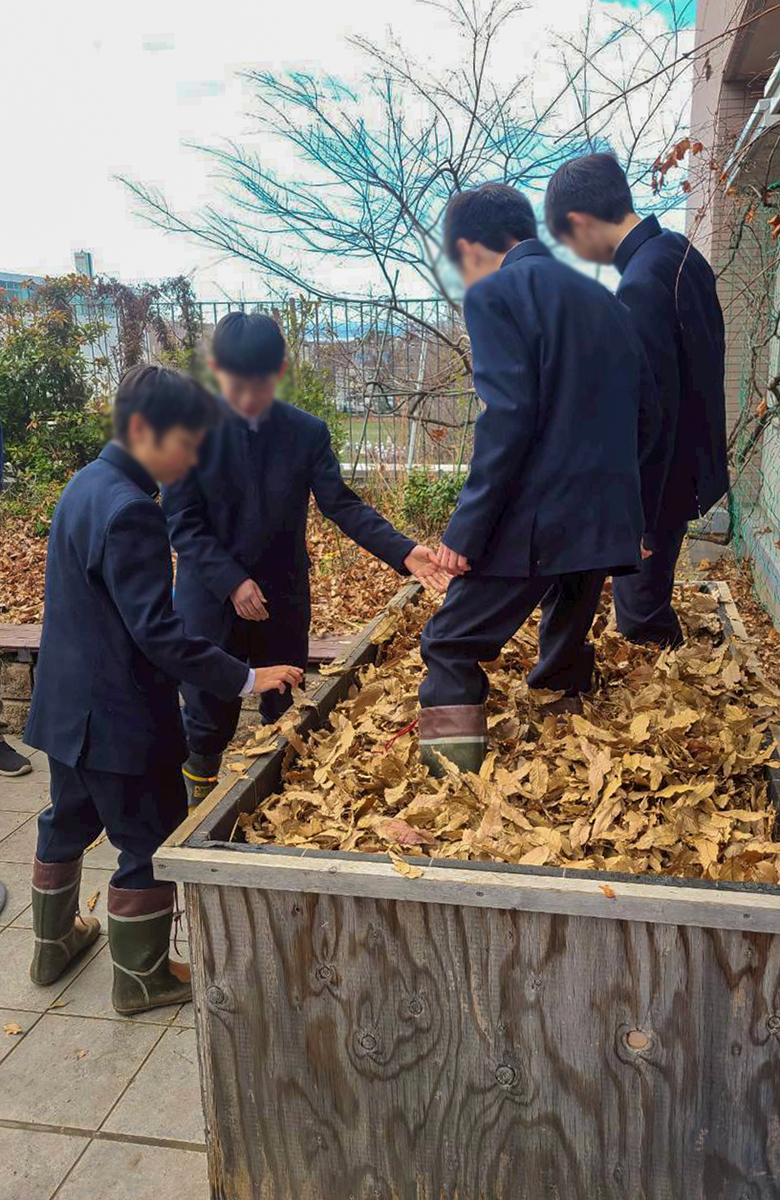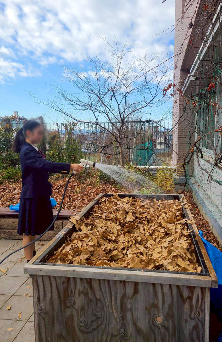 まず、校内の落ち葉を2つのコンポストにそれぞれ入れ、生徒たちが順番に踏んで、水をかけました。コンポストは「温度・水・酸素」といった条件がそろうことで発酵が進むことを、おさらいしました。こうして仕込んだ堆肥が、来年の花壇を支える大事な宝になっていきます。