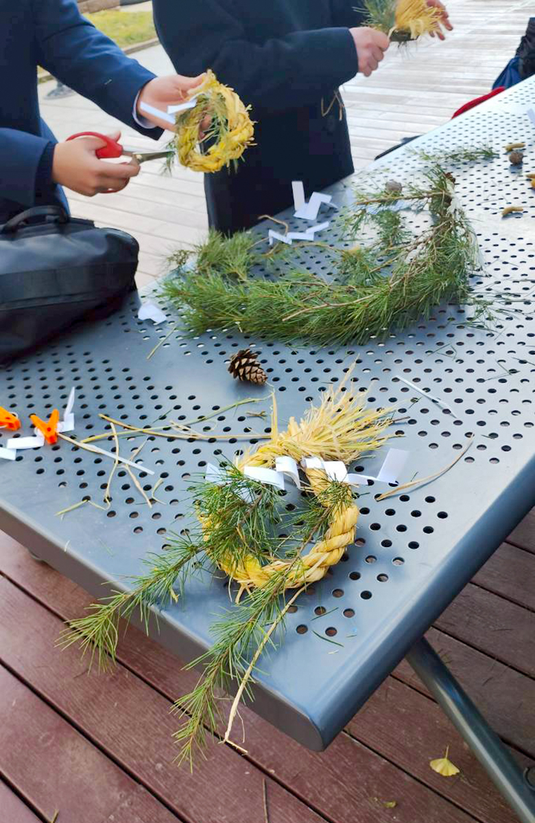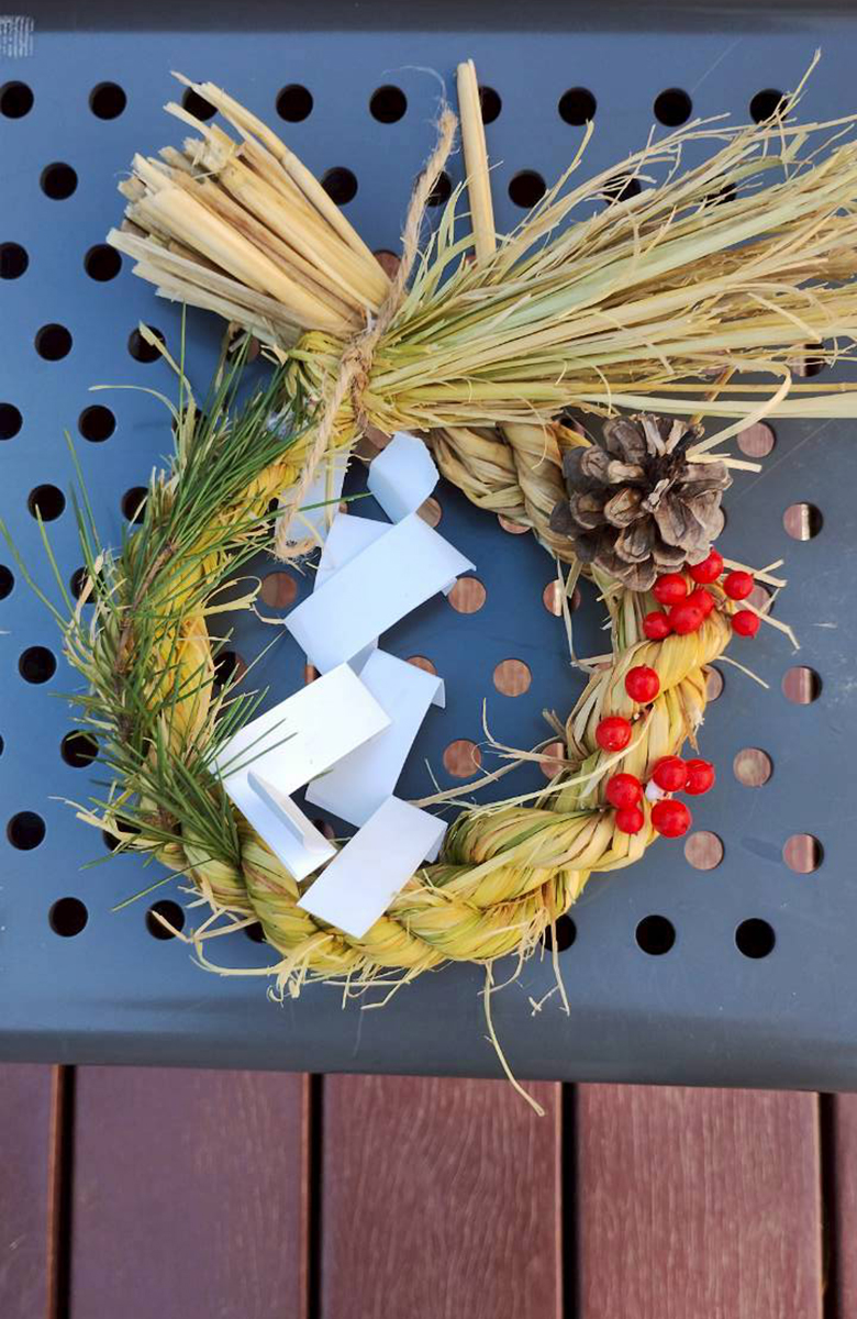 一人のしめ縄が完成でしたら、選手交代。二人目のしめ縄も同じようにつくっていきます。できあがったしめ縄の飛び出た部分をハサミで整えつつ、南天の実や松の枝でデコレーションしていきました。同じ素材でも表情の違うしめ縄が次々にできあがりました。