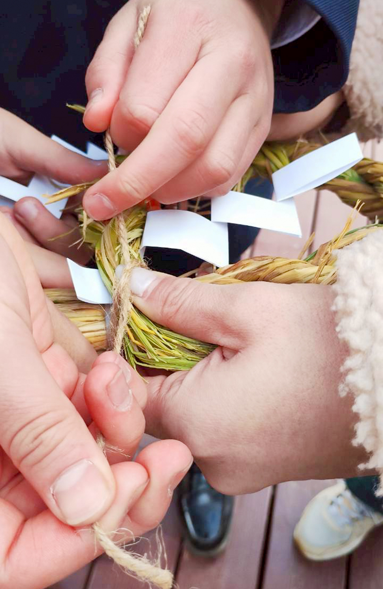 二人一組になって、片方が結束バンドで束ねた稲わらを持ち、もう片方がつくっていきます。まずはワラを3つに分け、右方向にぐりぐりとねじって1本目の縄をつくり、同様につくった2本目の縄と交差させながらねじって、太い縄にします。最後に3本目の縄をつくってその上に沿わせ、さらにしっかりした縄に仕上げます。これを輪の形にして、紙を折った「紙垂(しで)」を挟み込んだら、麻ひもで縛ってしめ縄が完成です。