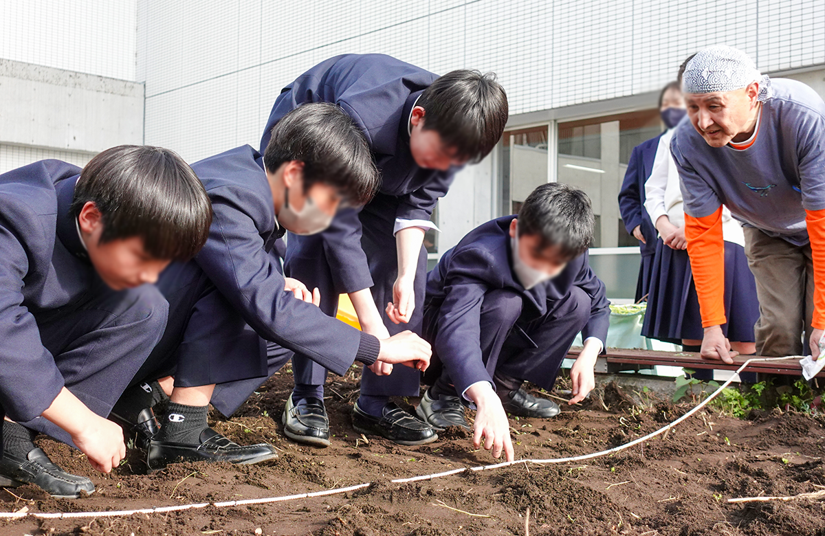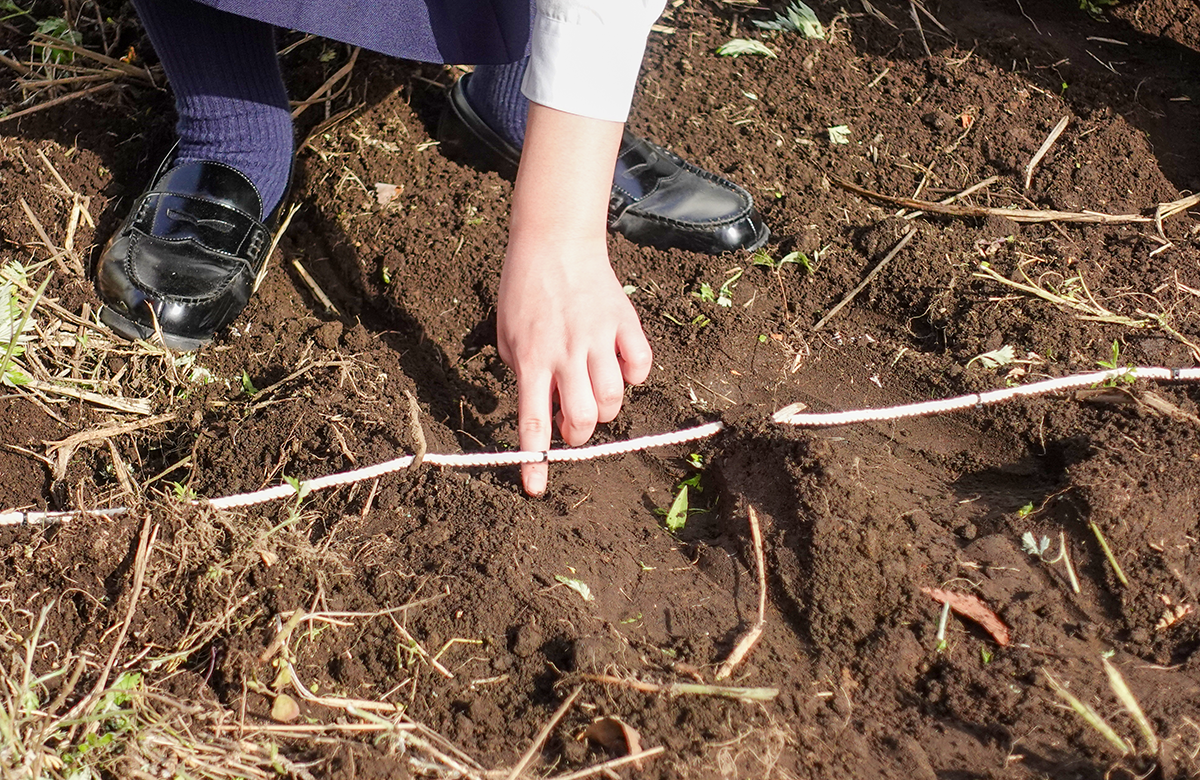 新2年生にとっては、これが二度目の挑戦。講師の先生がピンと張った紐にある「黒い点」を目印に、生徒たちは一粒一粒、丁寧に種を蒔いていきます。
