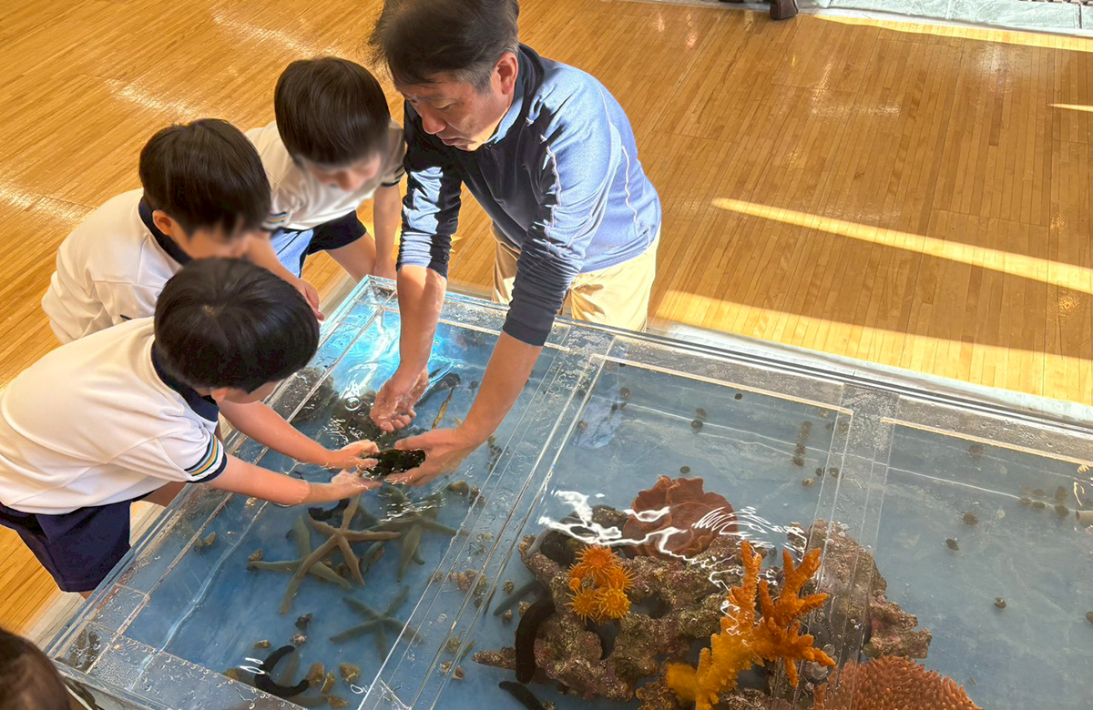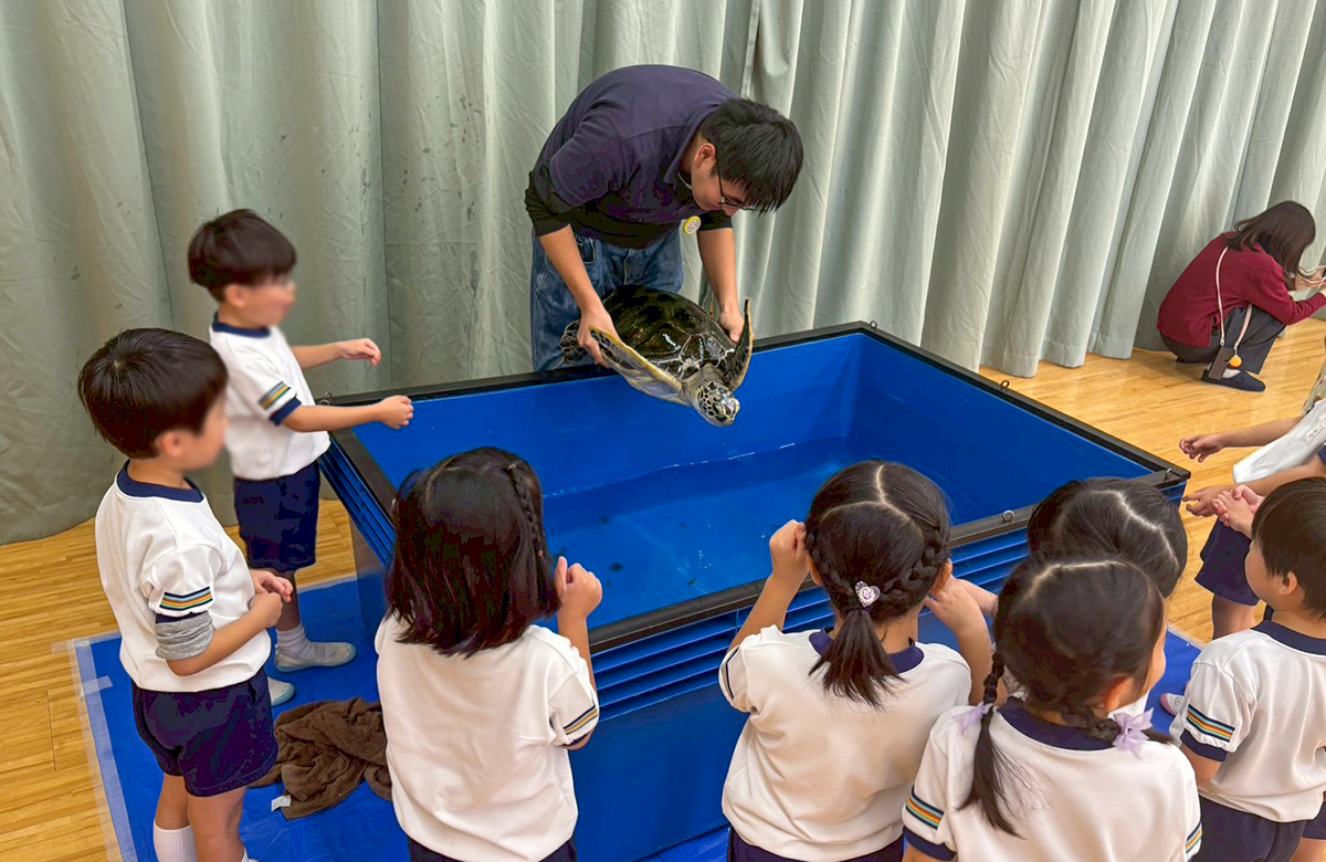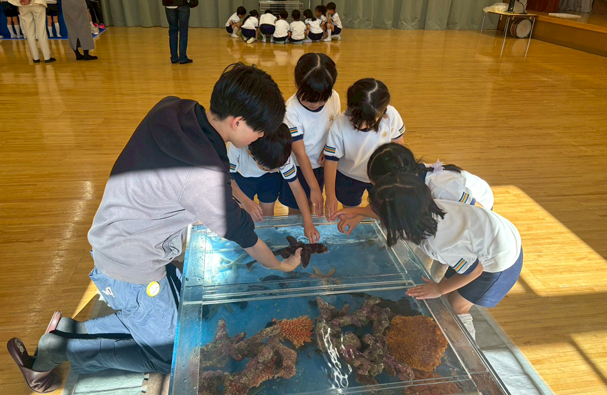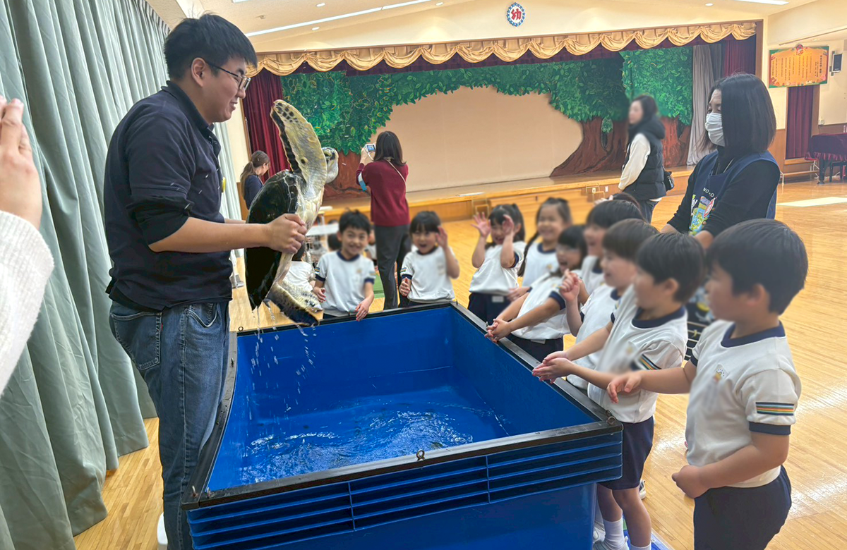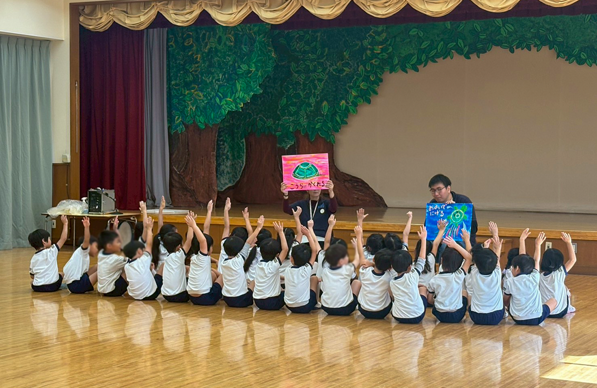 アオウミガメの紙芝居を通して生きものについて学んだり、園内にはさまざまな海の生きものが並び、子どもたちは間近で観察したり、実際に触れ合ったりしながら、目をキラキラさせ楽しく学ぶことができました。